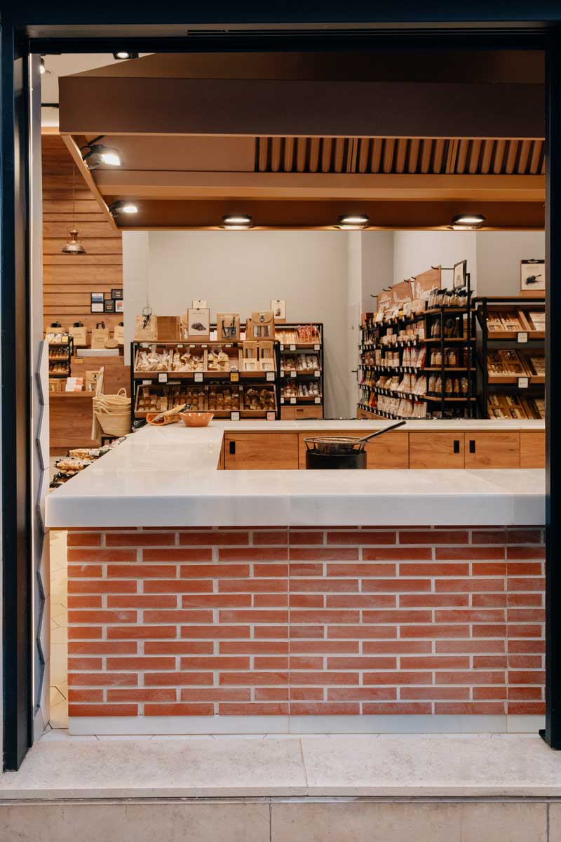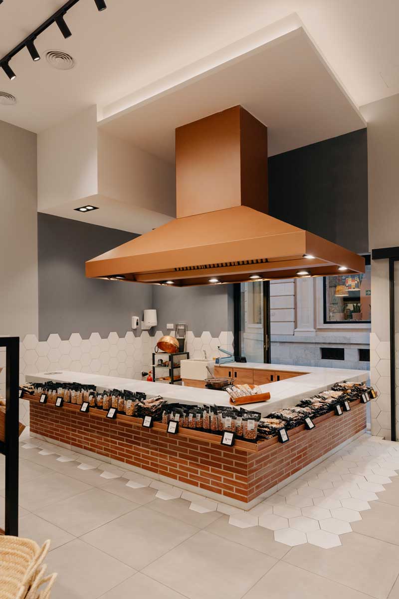 Para el diseño interior, se seleccionaron materiales duraderos y de calidad que aportan calidez y sobriedad. El uso de madera natural en el mobiliario y las estanterías, combinado con elementos de ladrillo visto y cerámica hexagonal, genera un ambiente que refuerza la imagen artesanal de la marca sin renunciar a un lenguaje contemporáneo. La zona central de trabajo abierta, equipada con una campana extractora de líneas limpias y acabado cobrizo, permite la elaboración a la vista, fomentando la interacción con el cliente.